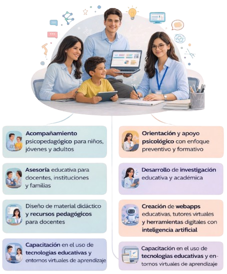 Ofrecemos acompañamiento educativo, psicopedagógico y psicológico, con un enfoque humano, ético y sustentado en evidencia científica. Realizamos investigación educativa aplicada y diseñamos material didáctico para docentes, además de desarrollar webapps educativas, tutores virtuales y soluciones tecnológicas con inteligencia artificial que fortalecen la enseñanza y mejoran el aprendizaje.